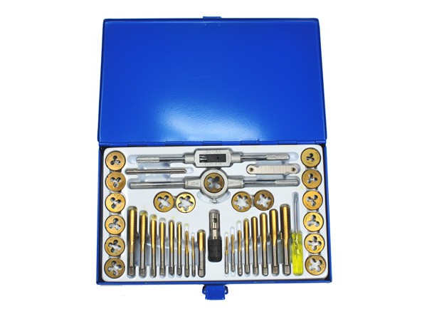 合金钢制造,铁盒包装。内含:17支扳牙:M3*0.5 、M4*0.7、 M5*0.8 、M6*1.0 、M7*1.0 、M8*1.25、 M10*1.5 、M12*1.75、 1/8NPT27、 4NC40 、6NC32 、8NC32 、1/4NC20、 5/16NC18、 3/8NC16 、7/16NC14、 1/2NC13;17支丝锥,1支扳牙扳手,1支丝锥扳手,T型丝锥扳手,1支牙规,1支螺丝批。