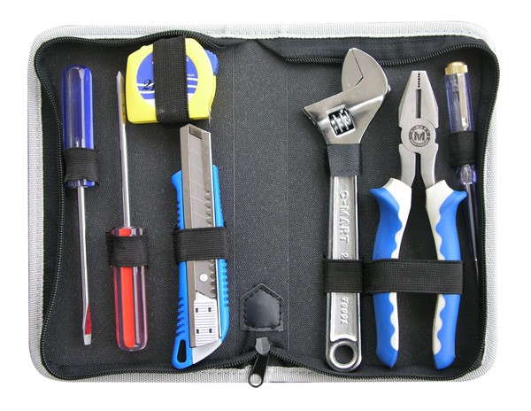 内含工具包括:十字螺丝批5*100、一字螺丝批5*100、美工刀一支、2m*13mm钢卷尺一支、8"活动扳手一支、7"美式电工钳一支、测电笔一支、帆布包一个。