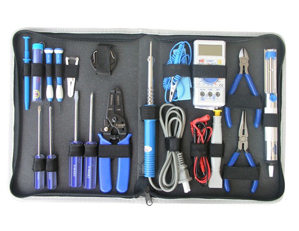 内含工具包括:三角爪一支、焊锡丝一支、1.4mm一字精密螺丝批一支、2.4mm一字精密螺丝批一支、散热夹一个、3*75十字螺丝批一支、3*75一字螺丝批一支、5*75十字螺丝批一支、5*75一字螺丝批一支、剥丝钳一支、烙铁架一支、30W电烙铁一支、防静电腕带一支、万用表一支、IC导入器一支、迷你斜嘴钳一支、迷你尖嘴钳一支、吸锡泵一支、帆布包一个。