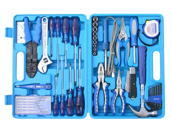 内含工具包括:8oz羊角锤一支、7"美式电工钳一支、6"美式尖嘴钳一支、6件套钟表批一套、30W电烙铁一支、7"电子多用剪一支、电工刀一支、8"活动扳手一支、剥线钳一把、3m*16mm钢卷尺一支、测电笔一支、9个 6.3mm套筒:4、5、6、7、8、9、10、11、12、13mm;8件套内六角一套、方杆一支、6*150mm十字螺丝批一支、6*150mm一字螺丝批一支、5*100mm十字螺丝批一支、5*100mm一字螺丝批一支、3.2*150mm十字螺丝批一支、3.2*150mm一字螺丝批一支、3.2*75mm十字螺丝批一支、3.2*75mm一字螺丝批一支。