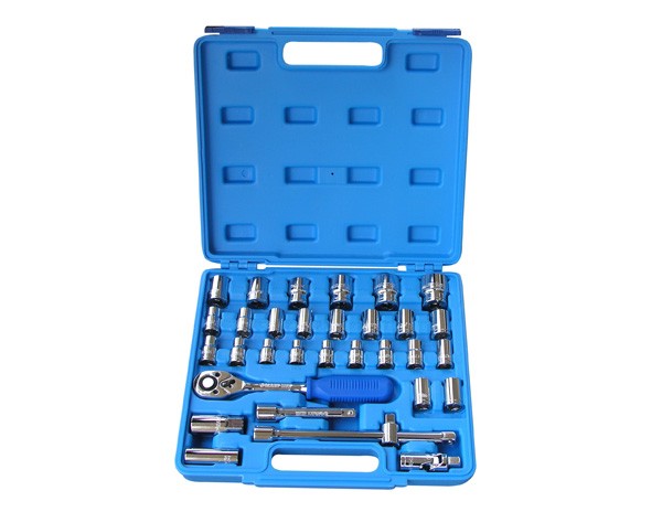 内含工具包括:1支棘轮套筒扳手、1个三用接头、1个万向接头、2个接杆 5",10";2个火星套筒:16,21mm;6个十二角套筒:10、12、14、15、17、19mm;19个套筒规格:8、9、10、11、12、13、14、15、16、17、18、19、20、21、22、24、27、30、32mm;1件吹塑盒。