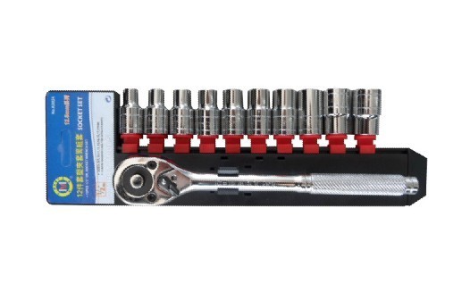 内含工具:1支F0281-3/8 光柄滚花棘轮套筒扳手,10支10mm公制六角短套筒(规格:8、10、11、12、13、14、15、16、17、18mm),1个塑料夹套。